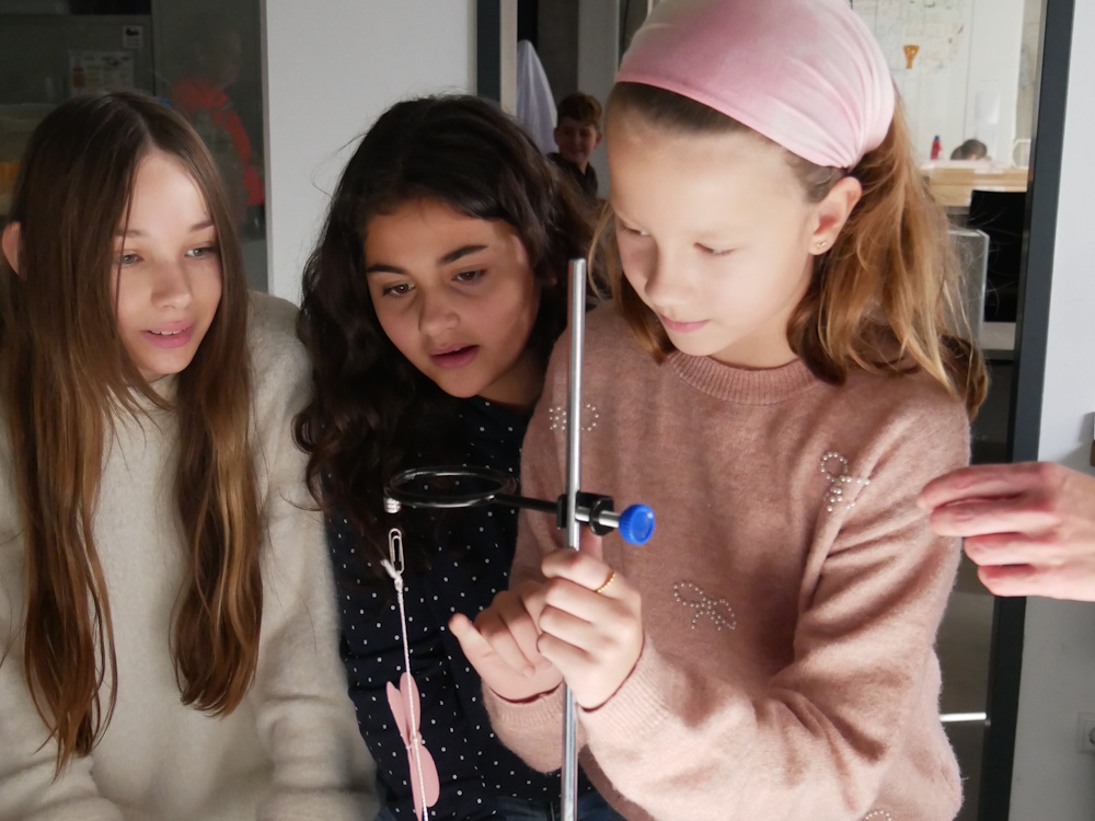 Jetzt war die Neugierde bei den Schüler/-innen natürlich geweckt, selbst Experimente auszuprobieren. In Vierergruppen versuchten sich die Fünftklässler zum Beispiel bei Versuchen zum Magnetismus, bei dem ein Schmetterling zum Schweben gebracht werden musste, oder erfuhren beim Versuch „wirbelnde Ströme“ wie Magnetfelder Magneten abbremsen, ein Verfahren, das in Bremssystemen eingesetzt wird.