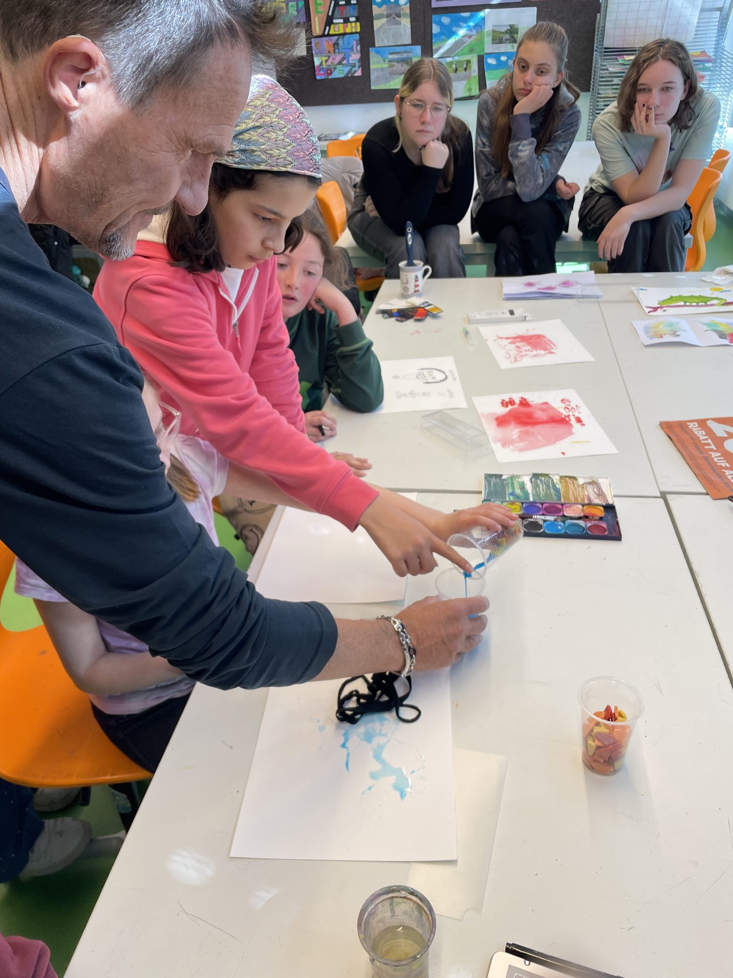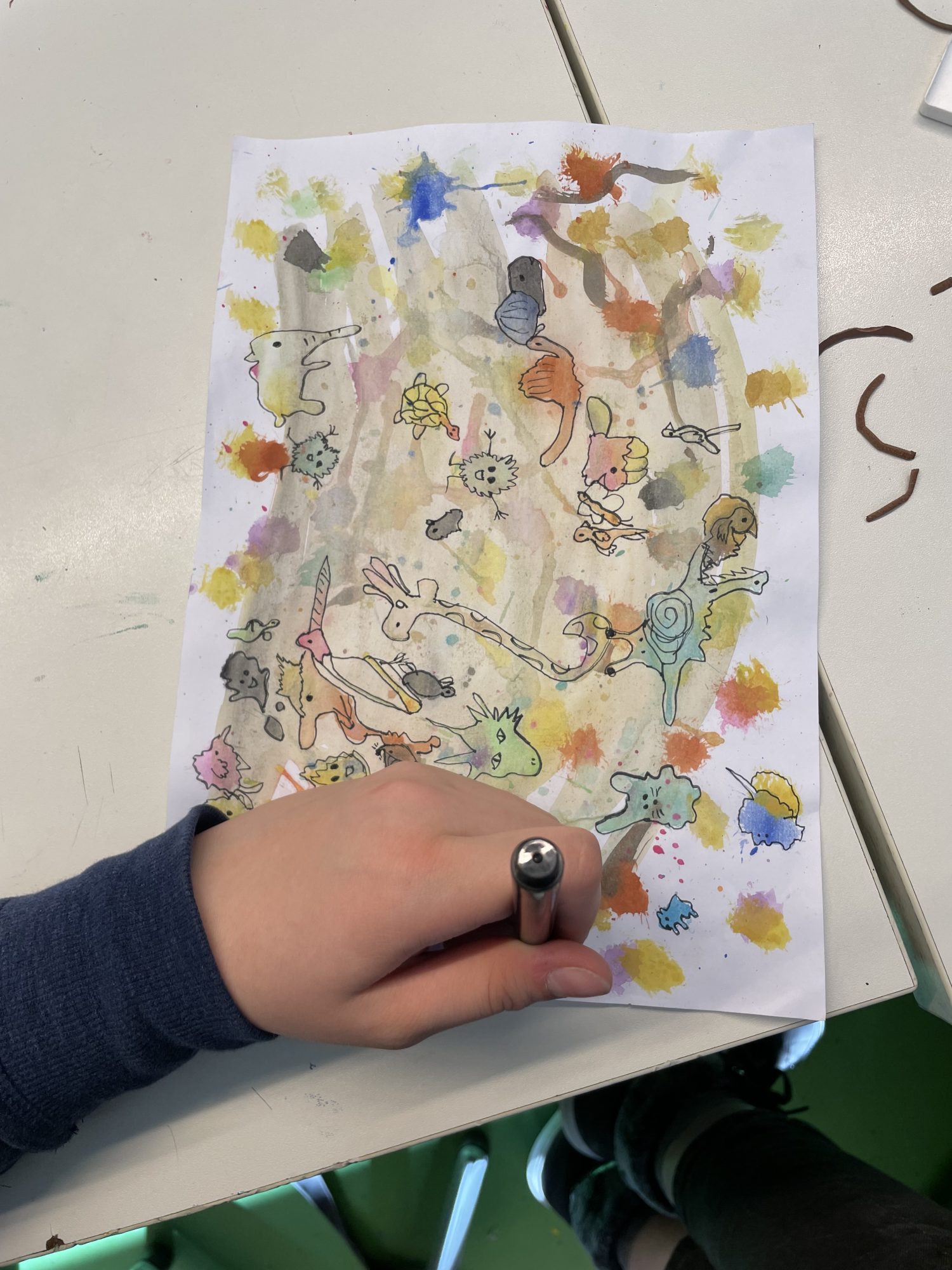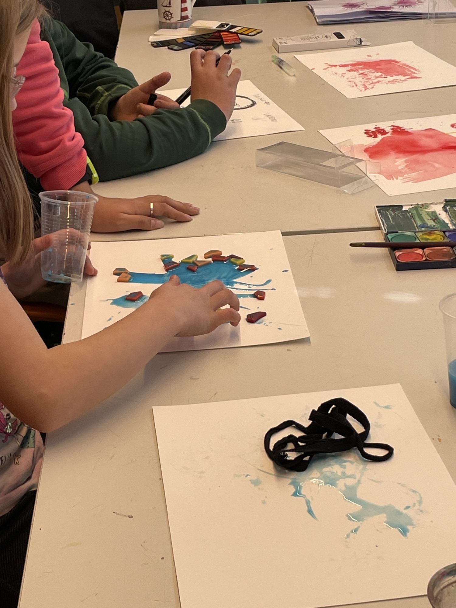 Seit einigen Wochen begleitet der Forster Künstler Holger Schlenz unsere Kunst AG. Zum Einstieg und Kennenlernen haben wir uns unter seiner Leitung kreativ mit dem Zufall beschäftigt. Es entstanden viele kleine, fantasievolle und farbenfrohe Kunstwerke.