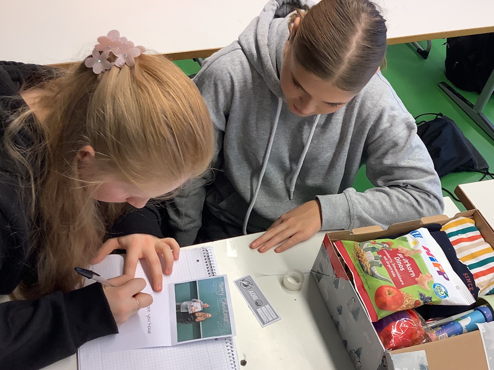 Unsere Schüler/-innen waren mit Feuereifer dabei und packten ganz oft auch handgeschriebene Briefe und Karten mit ein. Die Pakete luden wir ins Auto und fuhren sie zur ehrenamtlichen Abgabestelle nach Blankenloch. Von dort aus wurden sie über Verteilzentren in alle Welt verschickt. Im letzten Jahr kamen so allein im deutschsprachigen Raum fast 300.000 Pakete zusammen, und über 8.000 Ehrenamtliche haben die Aktion unterstützt.