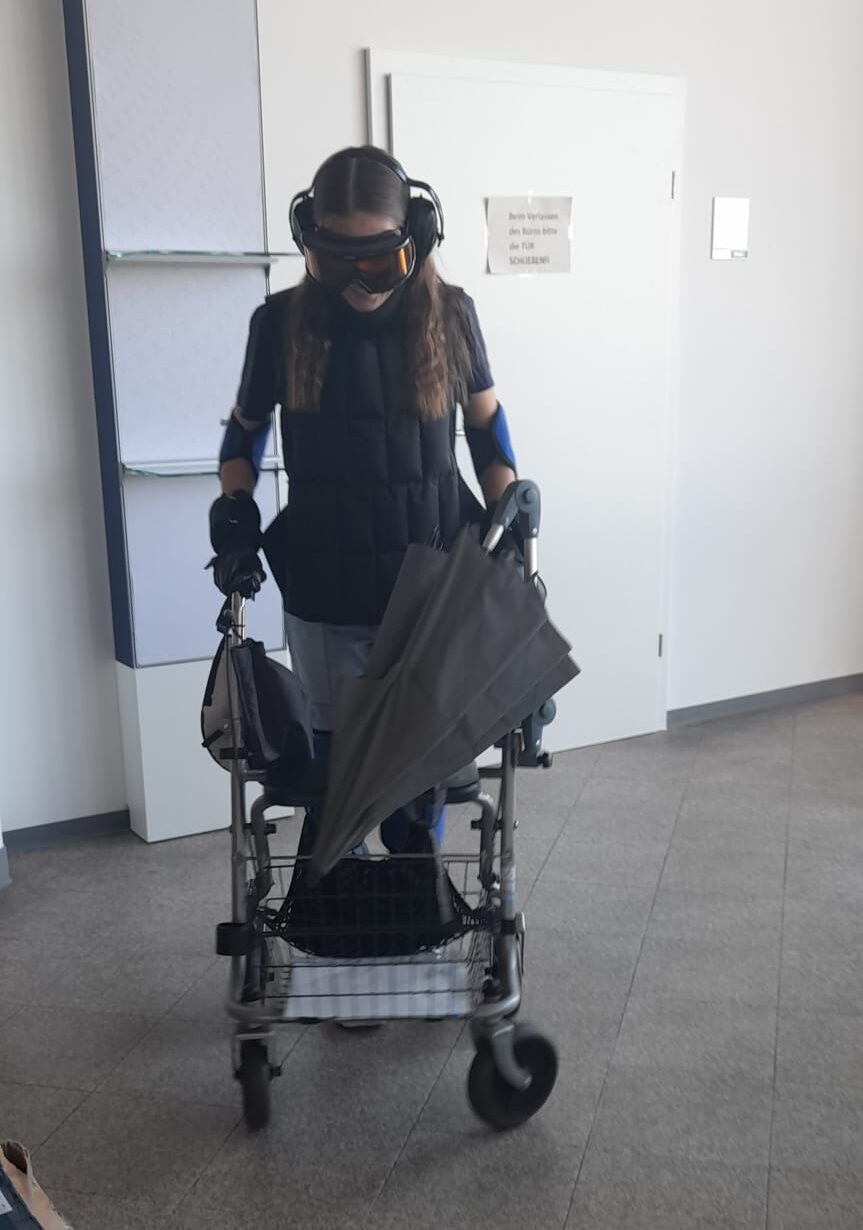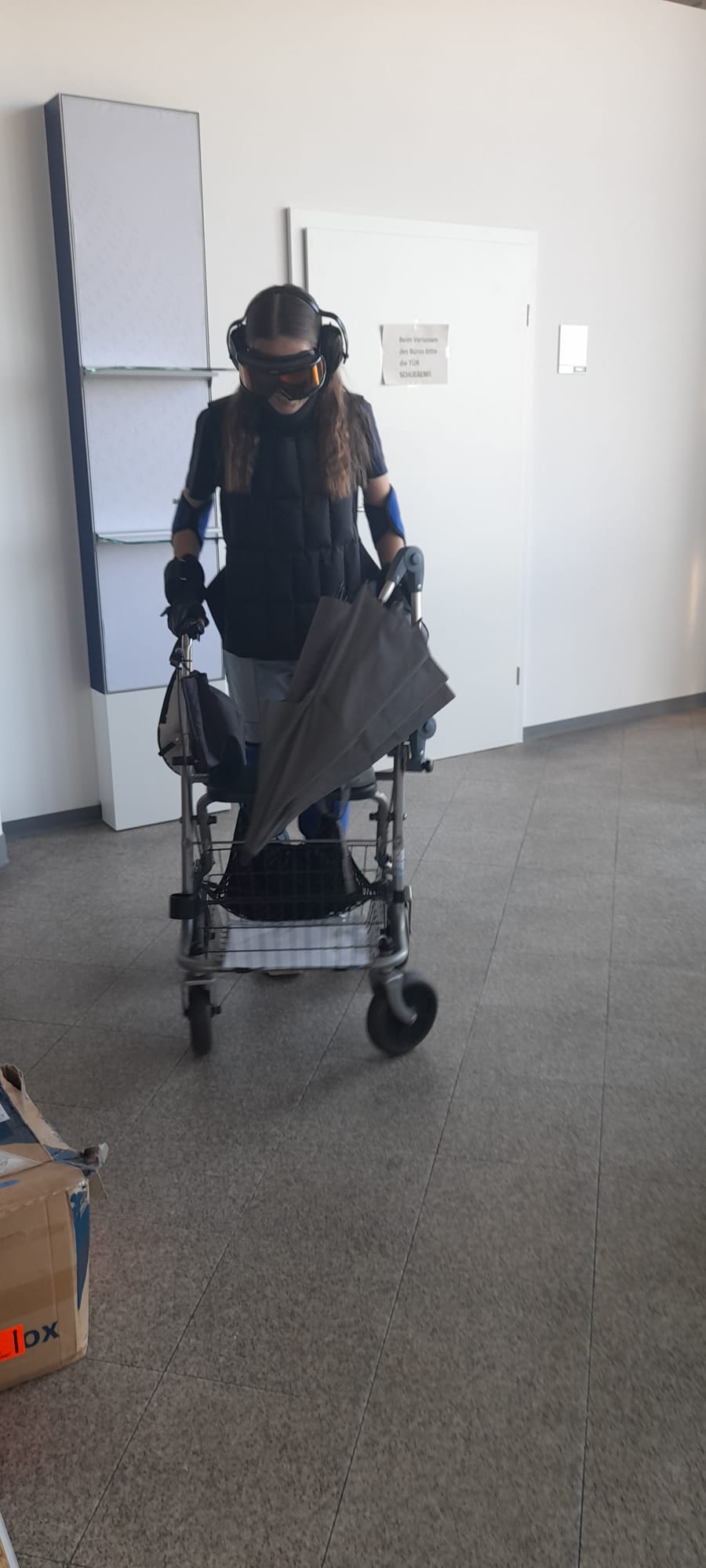Um zu erfahren, wie sich ein alter Mensch fühlt und bewegt, durften die SchülerInnen im Sanitätshaus St. Georg einen Alterssimulationsanzug anprobieren und versuchen, mit diesem und Rollator zu laufen.